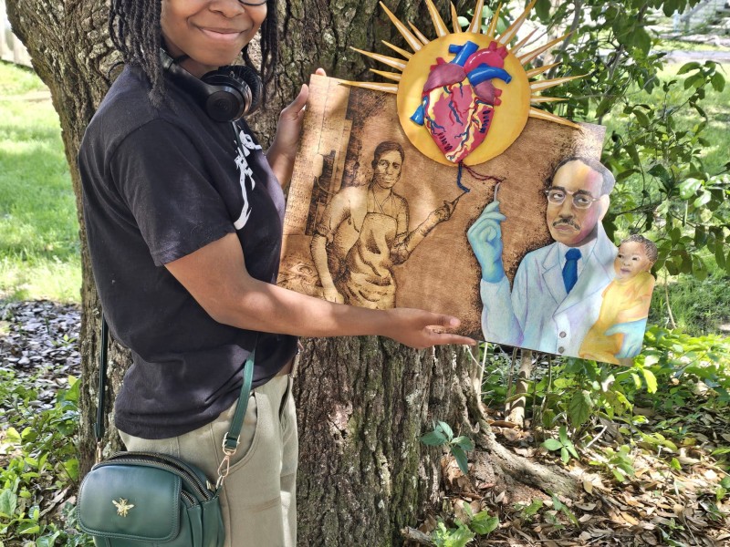 Jordyn Sledge of Jackson, MS, won the $1,000 Middle School Second Place prize for Heartstring. She represented the Ida B. Wells Academic and Performing Arts Complex. Her mixed-media artwork celebrates Unsung Hero Dr. Vivien Thomas, whose personal relevance to Sledge informed the creative process.