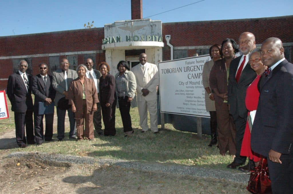 Left: Taborian Hospital of Mound Bayou; Right: Because inpatient care was nonexistent for most African Americans in Mississippi, several Black fraternal organizations built and staffed their own hospitals. One of these, the Taborian Hospital, was established in the all Black town of Mound Bayou in 1942. Theodore Roosevelt Mason Howard, MD, arrived as Chief Surgeon of the Taborian Hospital in 1947. In 2013, the Delta town received a $2.9 million grant from the Department of Agriculture to renovate and establish the Taborian Urgent Care Center. Since opening in 2016, the facility offers residents extended hours, walk-in access for acute illness, and injuries as well as physical and occupational therapy. Congressman Bennie G. Thompson represents Mound Bayou which is located in the 2nd congressional district. He is pictured (third from right) with organizers at the ground breaking dedication ceremony July 2013.